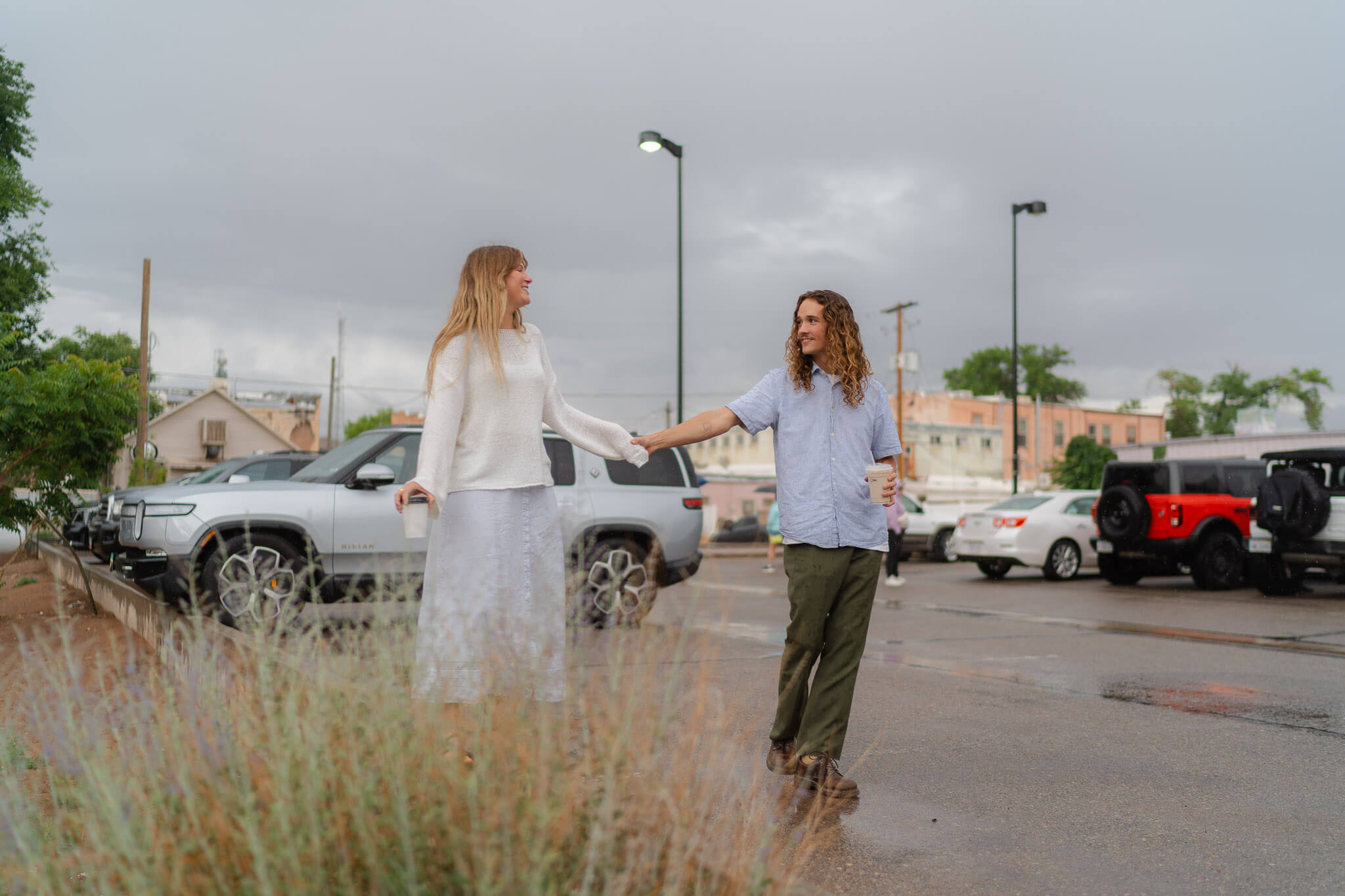 Our day began in downtown Moab at a cozy coffee shop. Emilie and Max, our adventurous couple, enjoyed coffee on the patio. A gentle rain fell—a rare and beautiful desert surprise. They didn’t let the weather dampen their spirits. Instead, they embraced the moment fully. Laughing and soaked, they ran through the rain back to their van. The relaxed timeline gave them space to enjoy every moment, ready for whatever the day would bring.