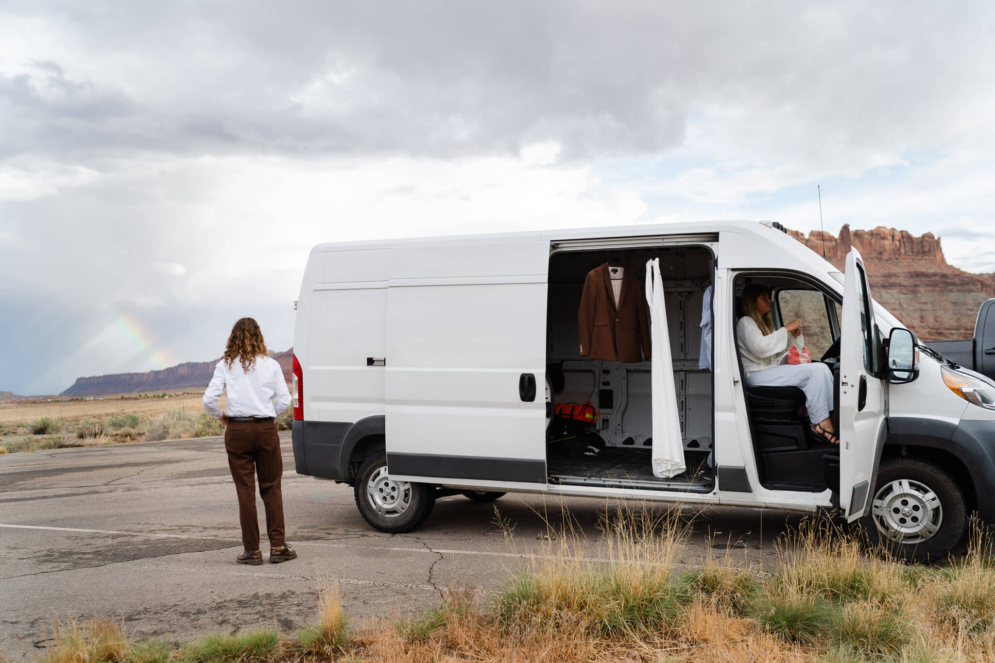 Chasing Rainbows on BLM LandAs we drove out of town toward the BLM lands outside Canyonlands and Dead Horse Point, the rain let up. Emilie and Max began getting dressed in their van, when suddenly a rainbow appeared over the red rock formations. Without hesitation, they ran out, twirling and dancing in the desert with the rainbow as their backdrop. It was spontaneous, joy-filled moment that set the tone for the rest of the day.