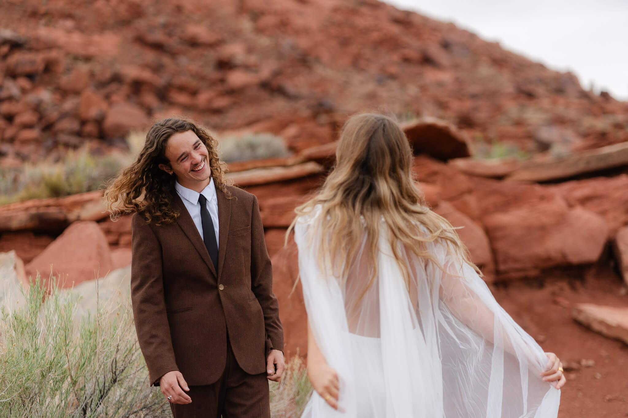 The two finished getting ready and shared a sweet first look at the foot of a towering rock face, surrounded by the quiet beauty of the open desert.