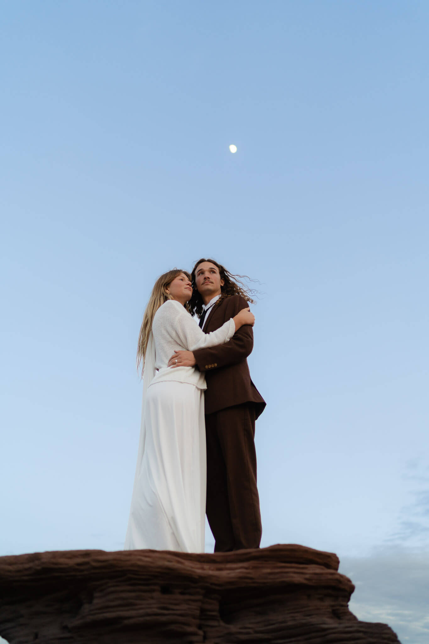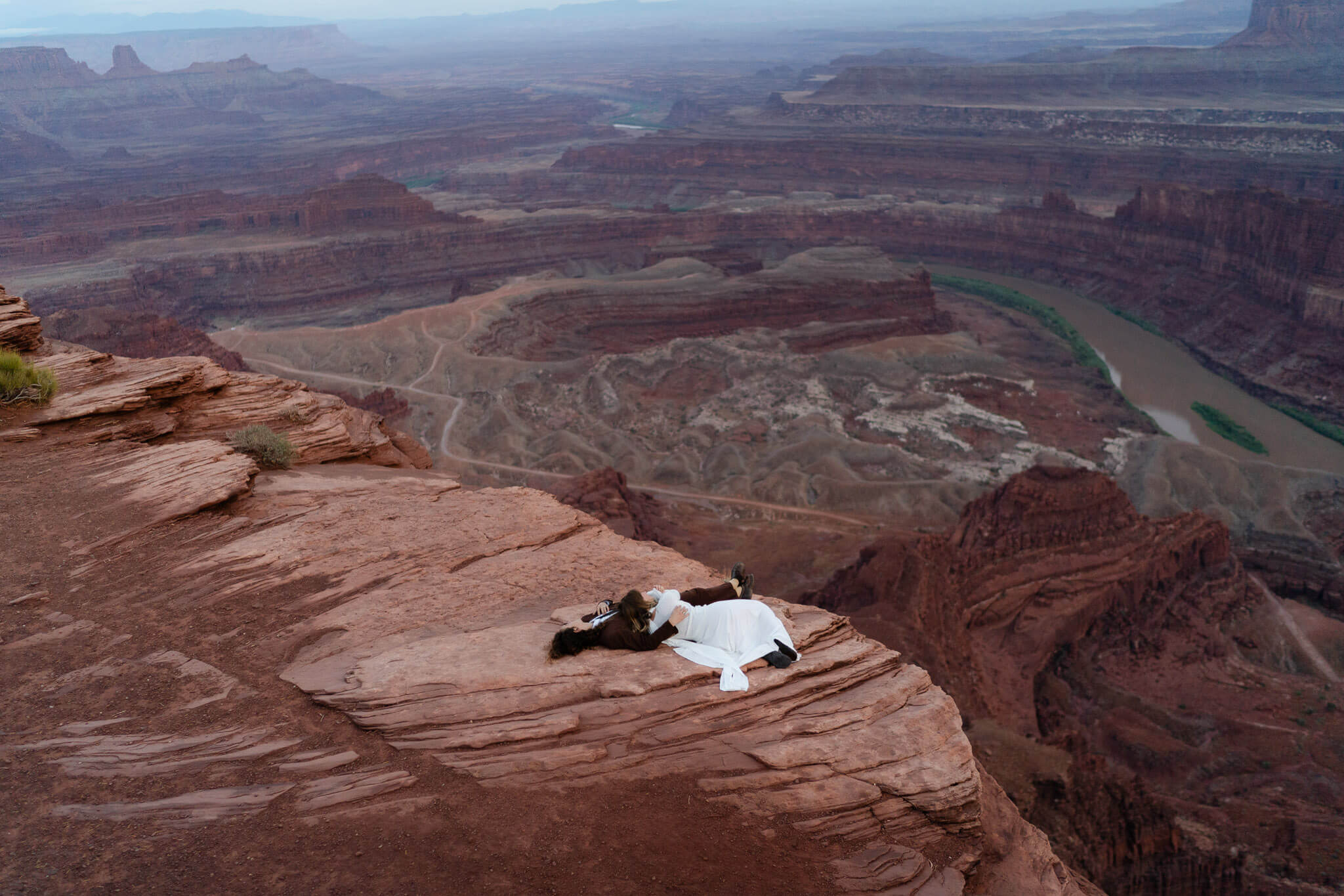 At Dead Horse Point, Emilie and Max explored the dramatic overlooks together. They wandered along the edge, taking in the view. The canyon stretched out endlessly beneath them. As the sun dipped lower, they found a quiet ledge and laid side by side, enjoying a peaceful moment together. The last rays of light warmed their faces as they watched the sky change colors. Everything felt still and calm around them. Blue hour began to settle in, painting the landscape in soft, cool tones. They took a few playful portraits, laughing softly in the fading light. The sense of adventure and the beauty of the moment made it unforgettable. Each second felt cinematic, like a scene from their own love story.