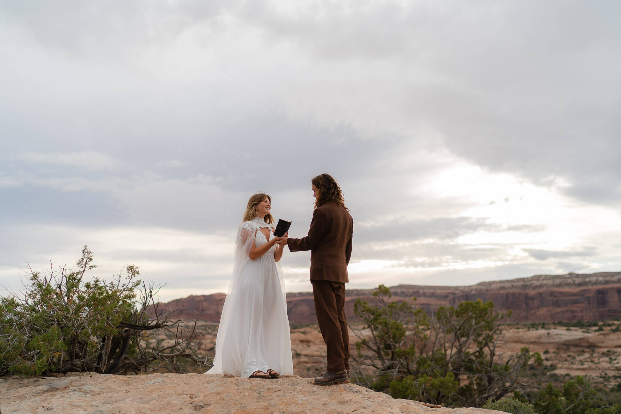 Next, we took a short off-road excursion to a ceremony spot I’d carefully scouted in advance. I wanted a place that felt like a true hidden gem—easy to reach by car, but far enough from the main roads that we had total privacy. This spot was off the beaten path, yet didn’t require a long hike or any special gear, making it perfect for couples who want adventure without too much effort. There, Emilie and Max exchanged heartfelt words, surrounded by nothing but sweeping views and the soft sounds of the wind. The privacy and tranquility of the BLM land made their ceremony feel truly intimate and personal, allowing them to focus completely on each other and the moment.